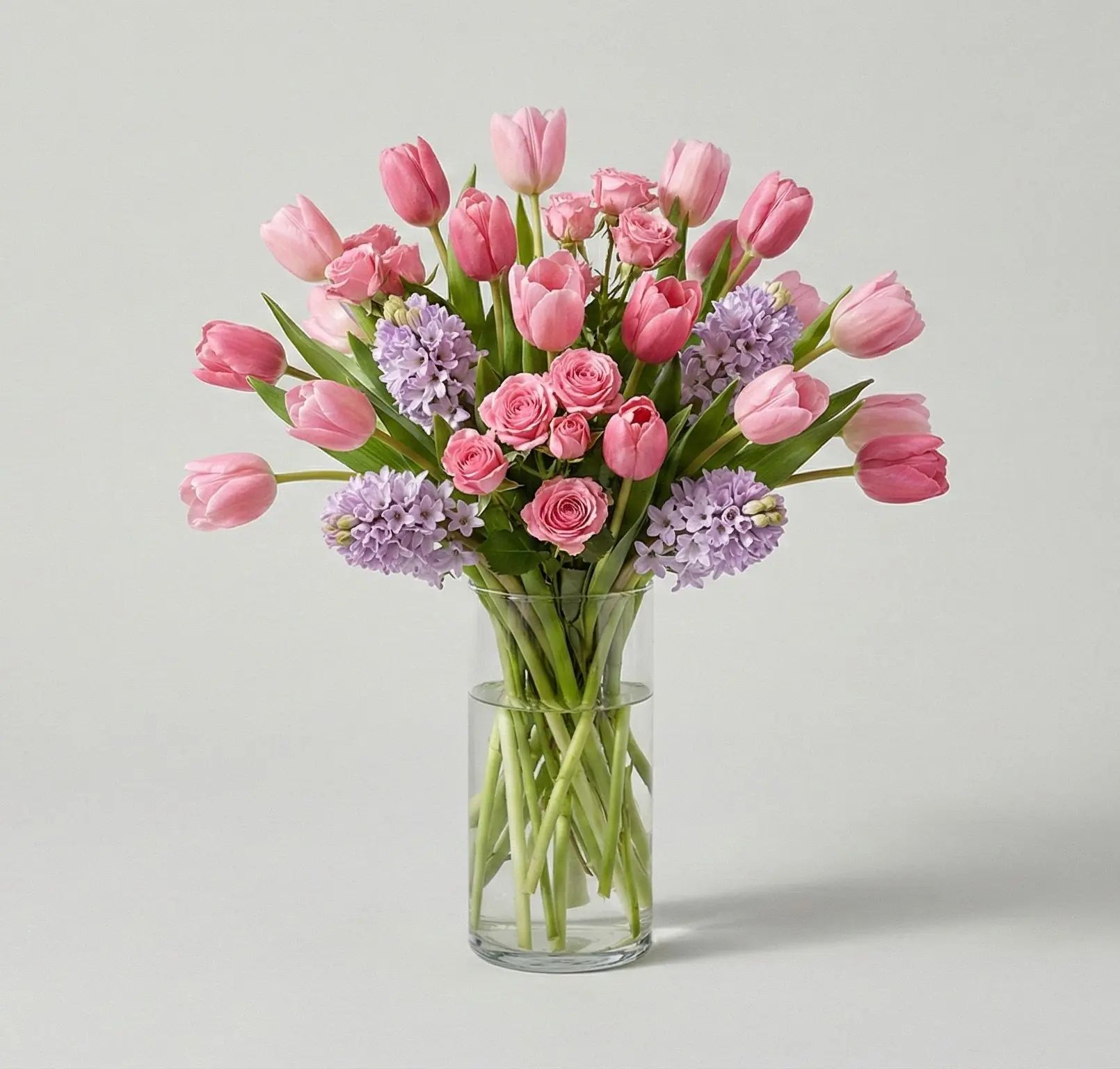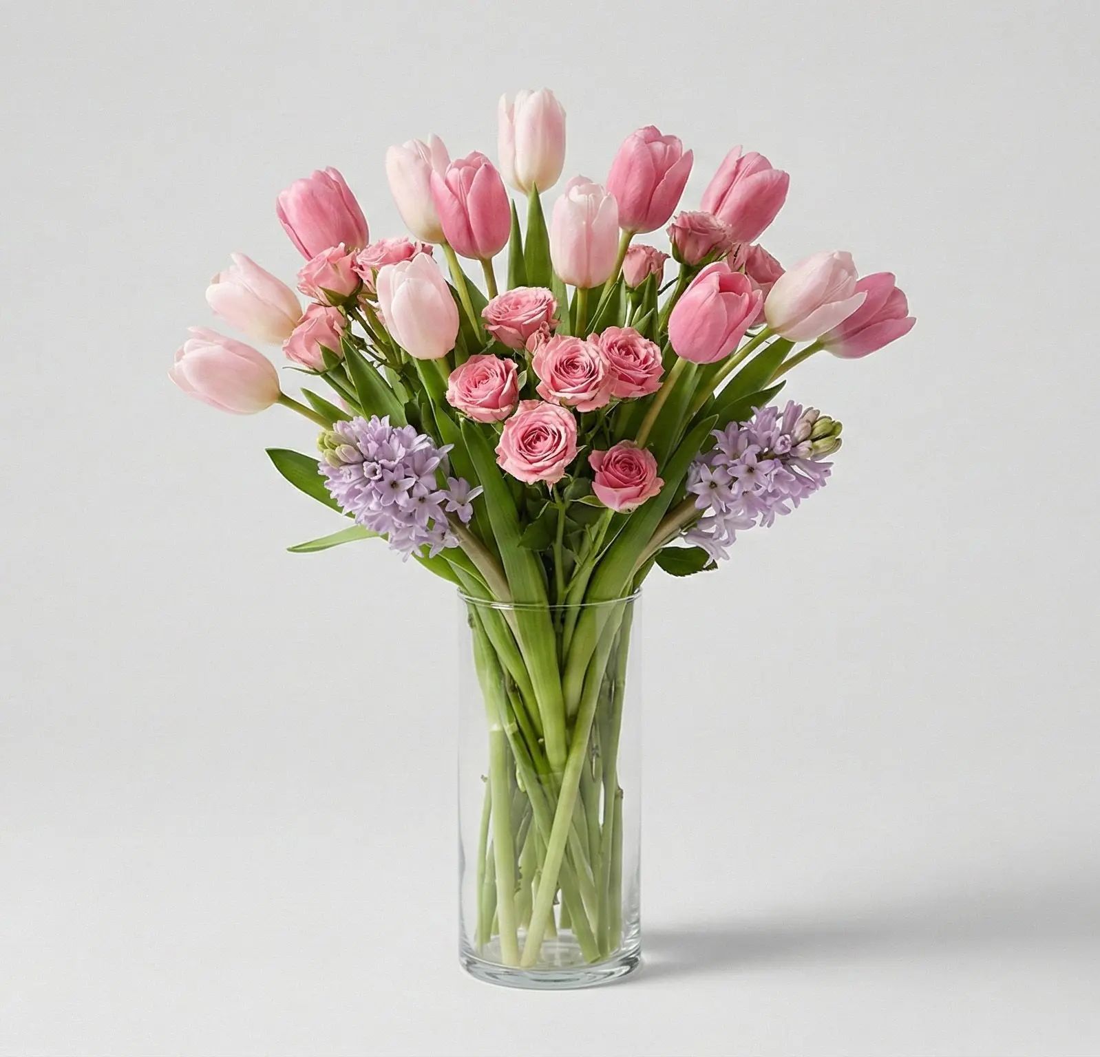 The Roselight Spring Symphony is a delicate bouquet featuring soft pink tulips, lush ranunculus, and fragrant hyacinths, arranged in a clear glass vase. This stunning display of springtime beauty brings warmth and freshness to any space, making it a perfect gift for any occasion, from birthdays to anniversaries, or simply to brighten up your home.